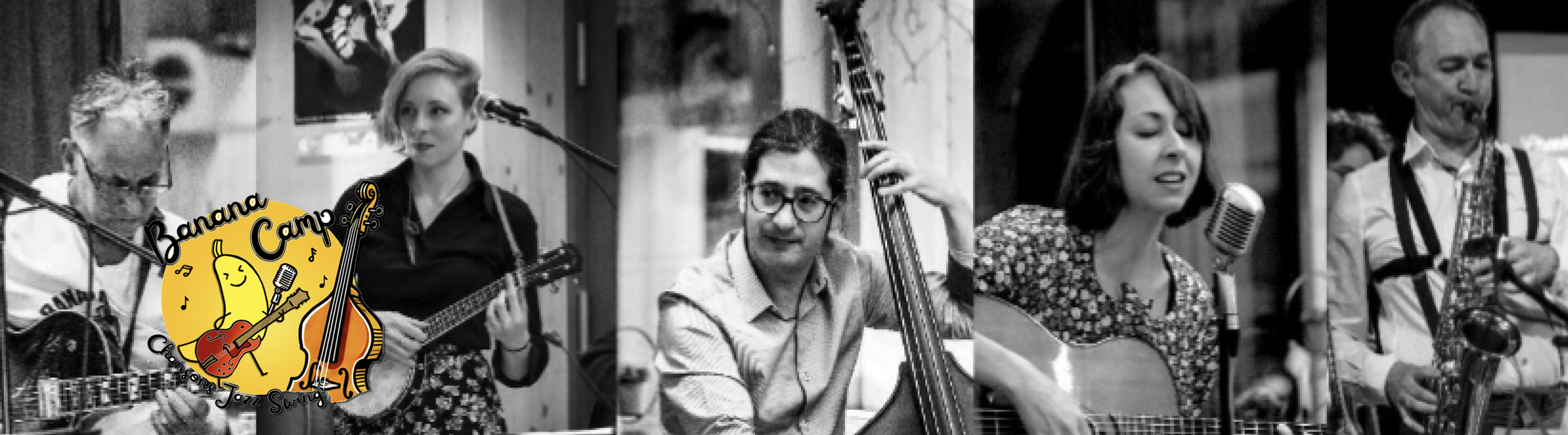Dans le Camp, il y a deux guitares, un banjolélé, une contrebasse, un saxophone, et des voix féminines qui font swinguer les coeurs. L’aventure Banana Camp commence au printemps 2021 en acoustique sur les marchés, à une époque où la musique nous avait tant manqué. Une centaine de concerts plus tard, des rencontres inoubliables ont été faites en chemin et le groupe est maintenant quelquefois accompagné par de talentueux danseurs de lindy hop. Des standards de jazz à la chanson française, avec une touche de jazz manouche… Banana Camp est un joyeux mélange de talents et d'influences unis par la passion du swing et une envie irrésistible de répandre la bonne humeur. Une musique ensoleillée, une énergie contagieuse... Banana Camp c'est la recette parfaite pour avoir la banane !